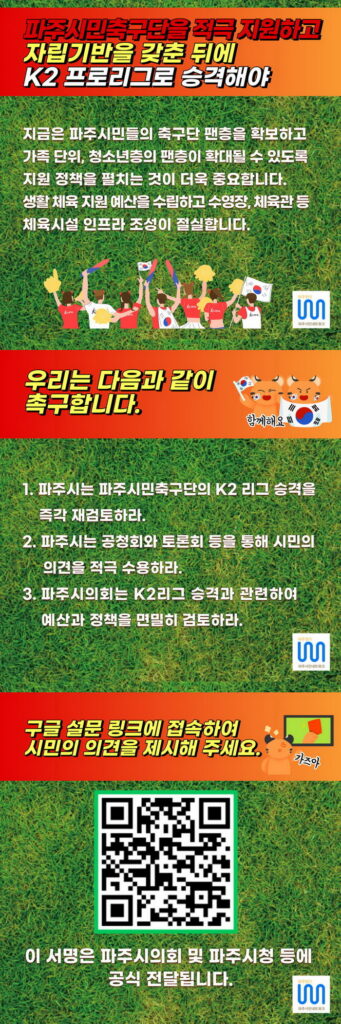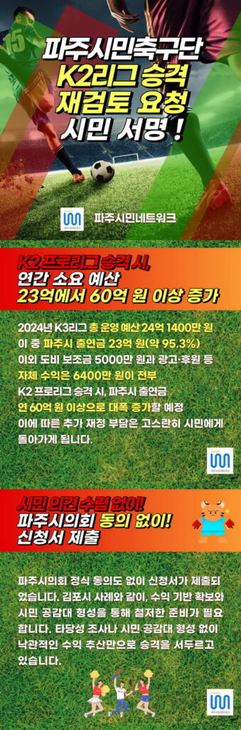 - 파주시는 파주시민축구단의 K2 리그 승격을 즉각 재검토하라.