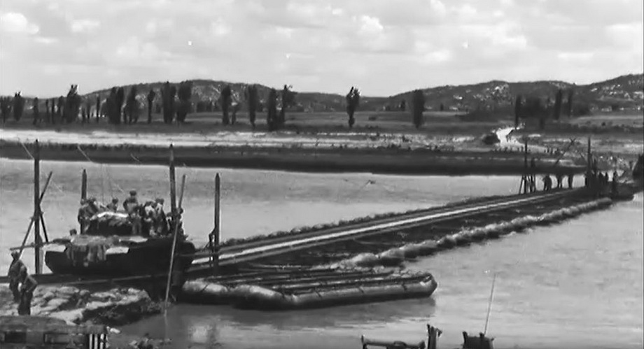 MLS, 교각의 3분의 2가 완성된 모습을 보여주고 있다. 프랭크 밀번 중장, 제1군단 사령관이 몇몇 장교들과 함께 완공된 구간 위에 서 있다. CU, 밀번. MS, 밀번이 다른 몇몇 인부들과 함께 지프에 올라탄다. M-46 전차에 탑승한 한국군. LS, M-46 전차가 새로운 부교를 건너기 시작한다. MLS, 교각 위에 몇몇 병력을 태우고 건너기를 기다리는 다른 M-46 전차들. MS, 교각 위로 이동하기 시작하는 미군 병사 몇 명을 태운 전차이다.