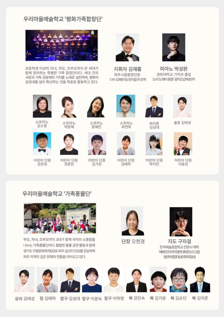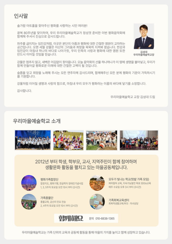 특히 이번 무대는 우리마을예술학교 가족들이 직접 참여해 의미를 더합니다. 온 가족이 함께 노래하는 평화가족합창단의 아름다운 하모니와 신명 나는 가족풍물단의 공연을 비롯해, 잔잔한 플루트와 피아노 4중주, 한국무용, 그리고 금산리 민요 공연까지 다채로운 프로그램이 어우러져 진정한 평화의 메시지를 전할 것입니다.
