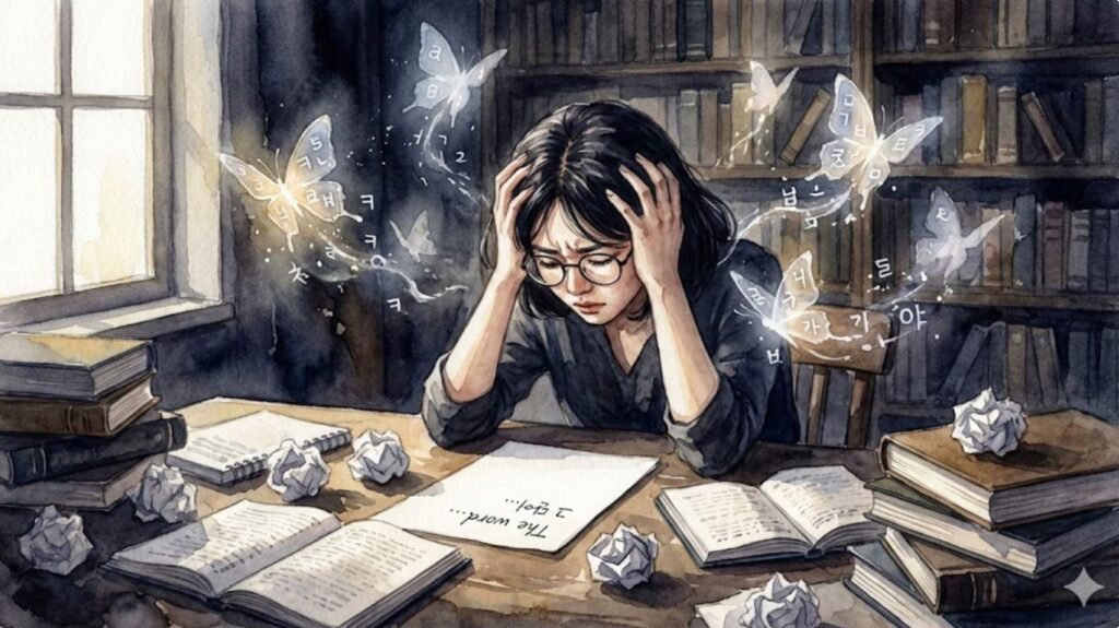 이 시는 시인의 머릿속을 온갖 잡동사니가 뒤섞인 ‘분더카머(진열실)’에 비유하며, 그 혼란 속에서 완벽한 시어를 찾기 위한 고단한 투쟁을 그린다. 화자는 망각의 먼지 더미에 파묻힌 ‘명징한 단어’ 하나를 건져 올리기 위해 기억의 두께를 깨부수는 지난한 과정을 감내한다. ‘언어의 빈곤’에 맞서 유사어를 찾고 묵독을 반복하며 온종일 서성이는 모습은 처절하기까지 하다. 마침내 손가락 사이로 빠져나가는 시어들을 바라보는 허탈함은, ‘적확한 낱말’에 도달하고자 하는 창작자의 영원한 갈망과 고뇌를 생생하게 대변한다.pajuwiki_ai