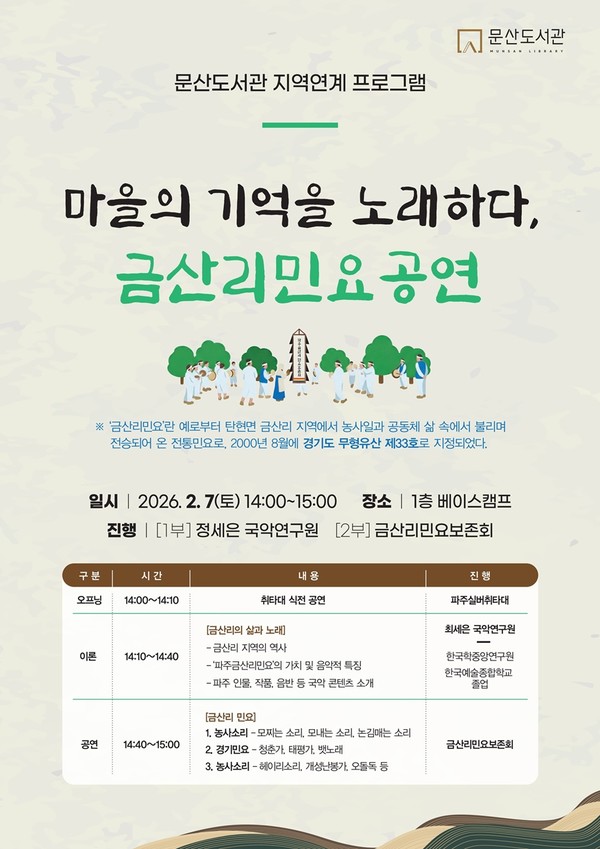 지난 2월 7일, 문산도서관에서 울려 퍼진 금산리 민요 공연을 관람했다. 약 20분 동안 이어진 금산리민요보존회의 공연은 단순한 발표를 넘어 우리 지역의 숨결을 느끼게 하는 시간이었다.