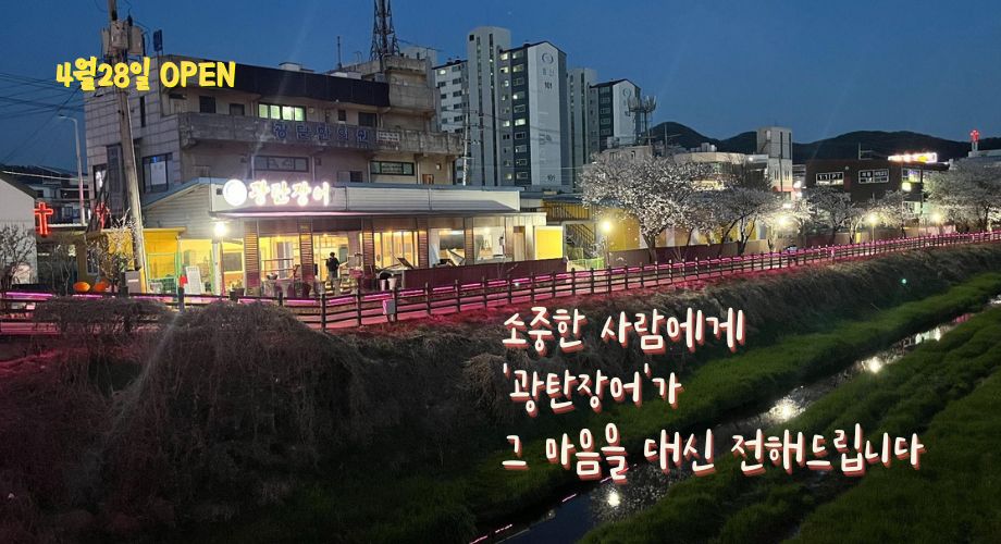 파주의 정겨운 풍경과 광탄의 한적한 여유로움이 머무는 곳, ‘광탄장어’가 개업했습니다. 굽이치는 하천변에 위치해 낮에는 화사한 산책길을, 밤에는 낭만적인 조명을 조망하며 최고의 보양식을 즐길 수 있는 곳입니다.