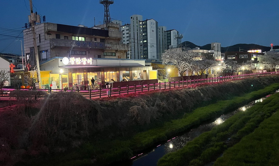 - 밤: 야간 조명이 은은하게 비치는 하천변 산책로를 배경으로 한 낭만적인 저녁 식사.
