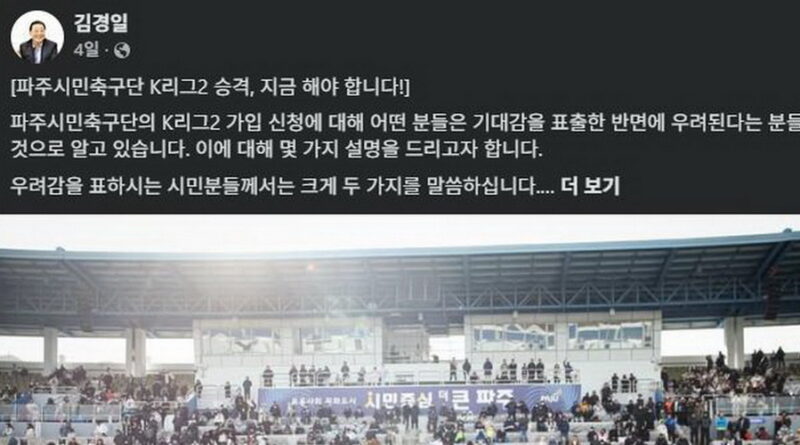 김경일 파주시장은 2025.7.24일 페이스북을 통해 최근 논란이된 파주시민축구단 k리그2 승격은 추진되어야 한다고 주장했다. 종전 파주시의회에 답변한 내용과 크게 다르지 않지만