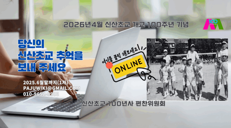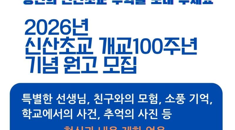 2026년 4월 7일 신산초등학교 개교 100주년을 맞아 신산초교 100주년 기념사업추진위원회는 동문들의 추억의 스토리를 모집합니다. 초등학교 시절의 추억이나 에피소드, 특별한 사진,