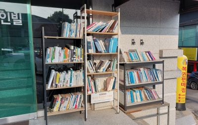 기증 도서의 부족으로 2023.4월에 2층 외벽에 설치되었던 나눔책장을 철거하고 기존 1층 주차장에 설치된 책장은 계속적으로 운영한다.paki 2023년 7월 27일 (목) 15:25 (KST)