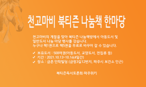 북티즌 나눔책방에서 보유하고 있는 책은 아동도서와 교양도서, 전집류 등으로 도서의 상태는 양호하다. 나눔 한마당 기간은 2021.10.13~10.16일까지 4일간이며 파주시 보건소 근처인 인학빌딩에서 열렸다.