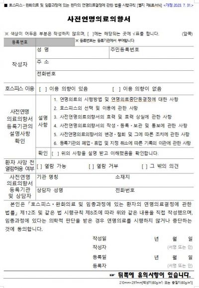 - 작성된 사전연명의료의향서 및 업무 수행 기록 등을 보관할 수 있도록 잠금장치가 설치된 문서 보관 설비를 구비할 것