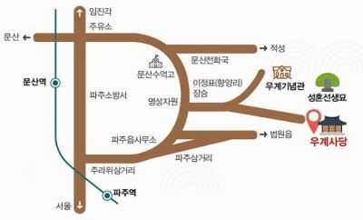 우계사당은 문산읍 선유산업단지 인근의 파주시 파주읍 향양리 산 8-2번지에 위치하며 향양1리 또는 향양3리 마을회관 방향으로 진입해야 한다.