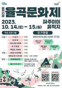 제33회 율곡문화제가 2023.10.14.~10.15일 파주이이유적지 및 도심지 일원에서 양일간 개최된다. 첫날 10.14일에는 기념식과 방방례, 자운서원 추향제, 유가행령, 백일장, 미술제가 열리고 10.15일에는 사임당 추모제향, 최태성 토크 콘서트 행사가 열린다.