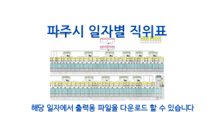 파주시에서 제공하는 본청 및 읍면동의 6급이상 공무원에 대한 일자별 조직도이다. PDF 파일로 작성되었으며 수집된 자료만 게시 됐다.